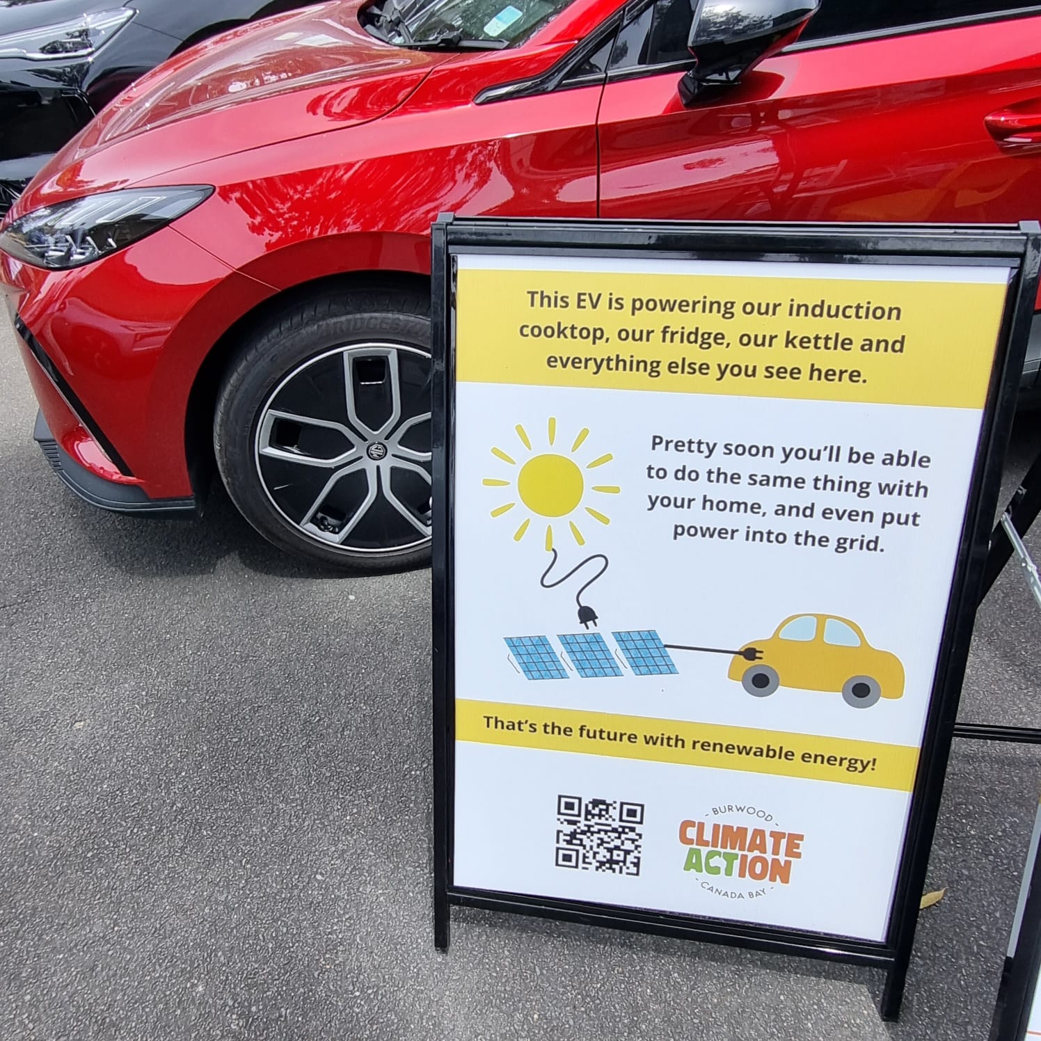 A big shout-out to Ken, President of Climate Action Burwood Canada Bay, who brought along his stunning red MG MG4, to to power our iMac and TV via Vehicle-to-Load (V2L), and shared his expert advice on the many benefits of going electric.